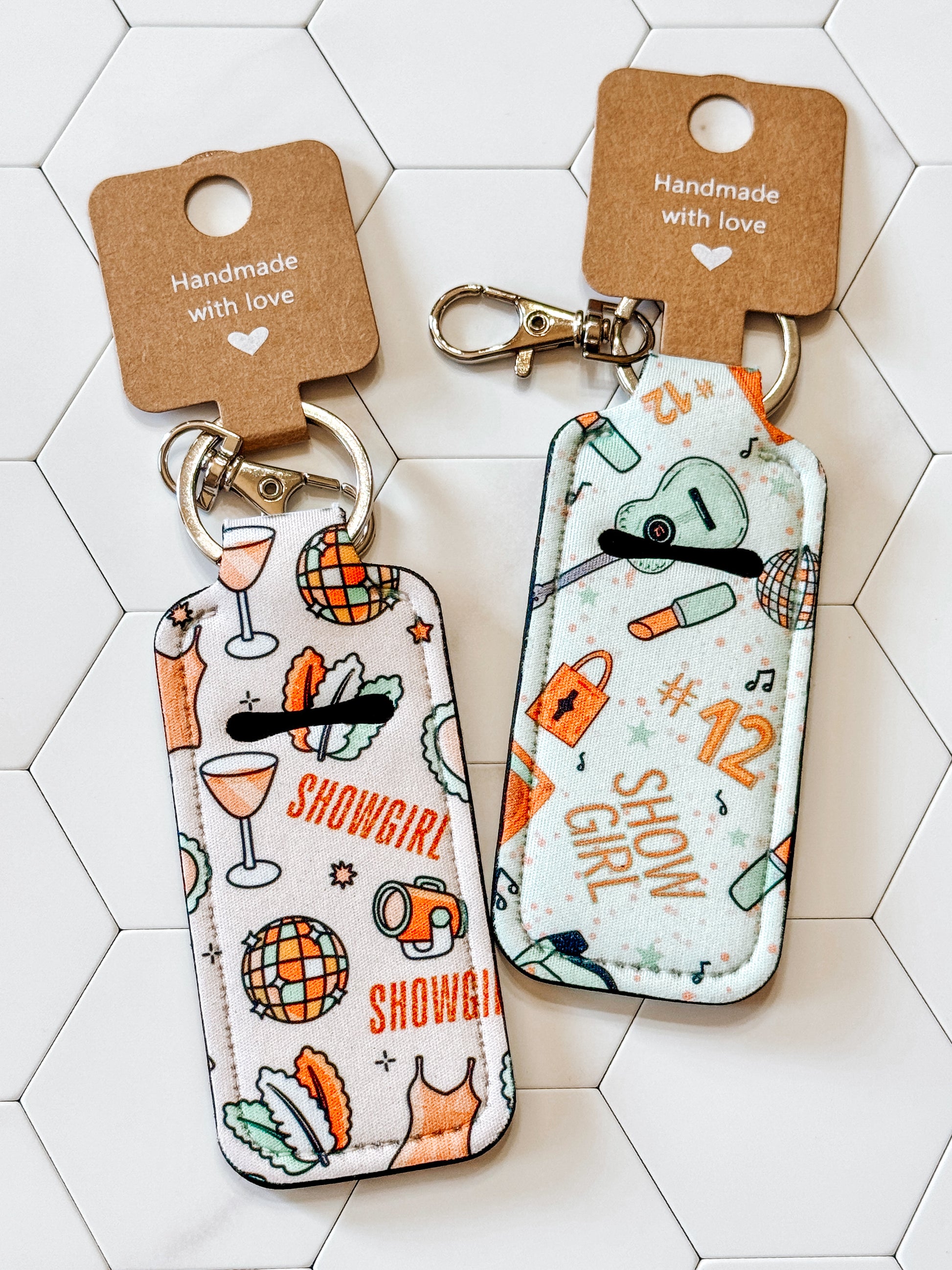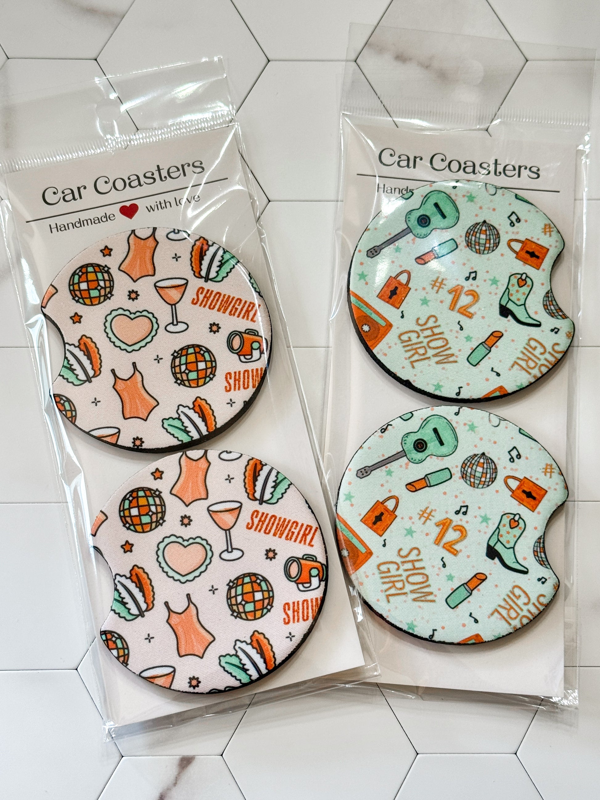 TS Showgirl Era Car Coasters and Keychain Lip Balm holders.